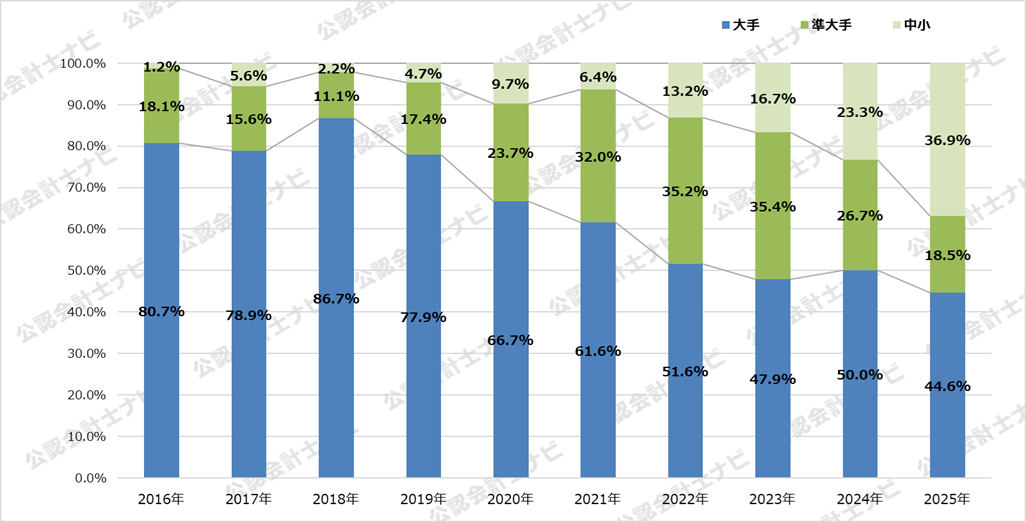 ※外国監査法人に関しては、国内の提携監査法人の規模に準じて分類し集計しています。(例:KPMG LLP、EY LLP→大手監査法人、BDO USA, LLP→準大手監査法人)