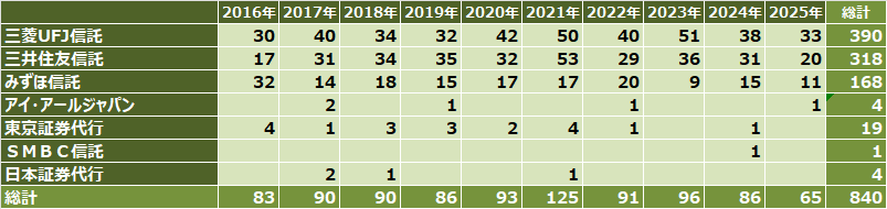 昨年までの、三菱UFJ信託銀行と三井住友信託銀行の2強+みずほ信託銀行という構図は2025年も継続しています。