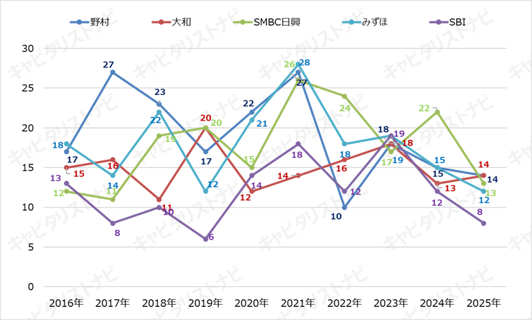 その中でトップに立ったのは野村と大和。件数は14件で同数でした。昨年突出していたSMBC日興証券は、今年は13件に。前年から9件減少し、順位も3位に後退する結果となっています。4位のみずほ証券は12件でトップ3に肉薄。SBI証券は前年の12件から8件へと減少し、数年ぶりに2桁を割りました。
